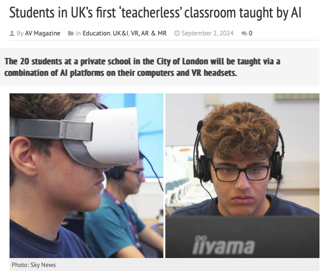 En Londres, el David Game College implementó una clase sin docentes humanos. Mediante IA y realidad virtual, los estudiantes reciben contenidos personalizados adaptados a su ritmo y necesidades. Tres coaches humanos supervisan y apoyan cuando es necesario.